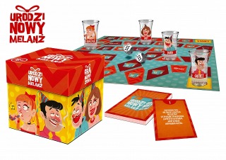W skład gry wchodzi: plansza, komplet kart z 16 zadaniami, 4 kieliszki ze śmiesznymi nadrukami, 8 pionków + kostka.