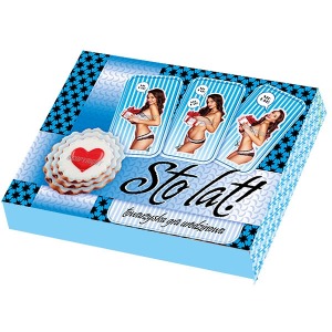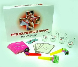 W zestawie: 4 kieliszki, gra karciana, trąbki, prezerwatywa.